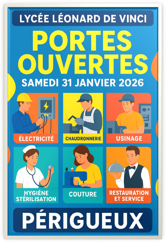 La journée portes ouvertes du lycée Léonard de Vinci à Périgueux aura lieu le samedi 31 janvier 2026 de 9h00 à 16h30.